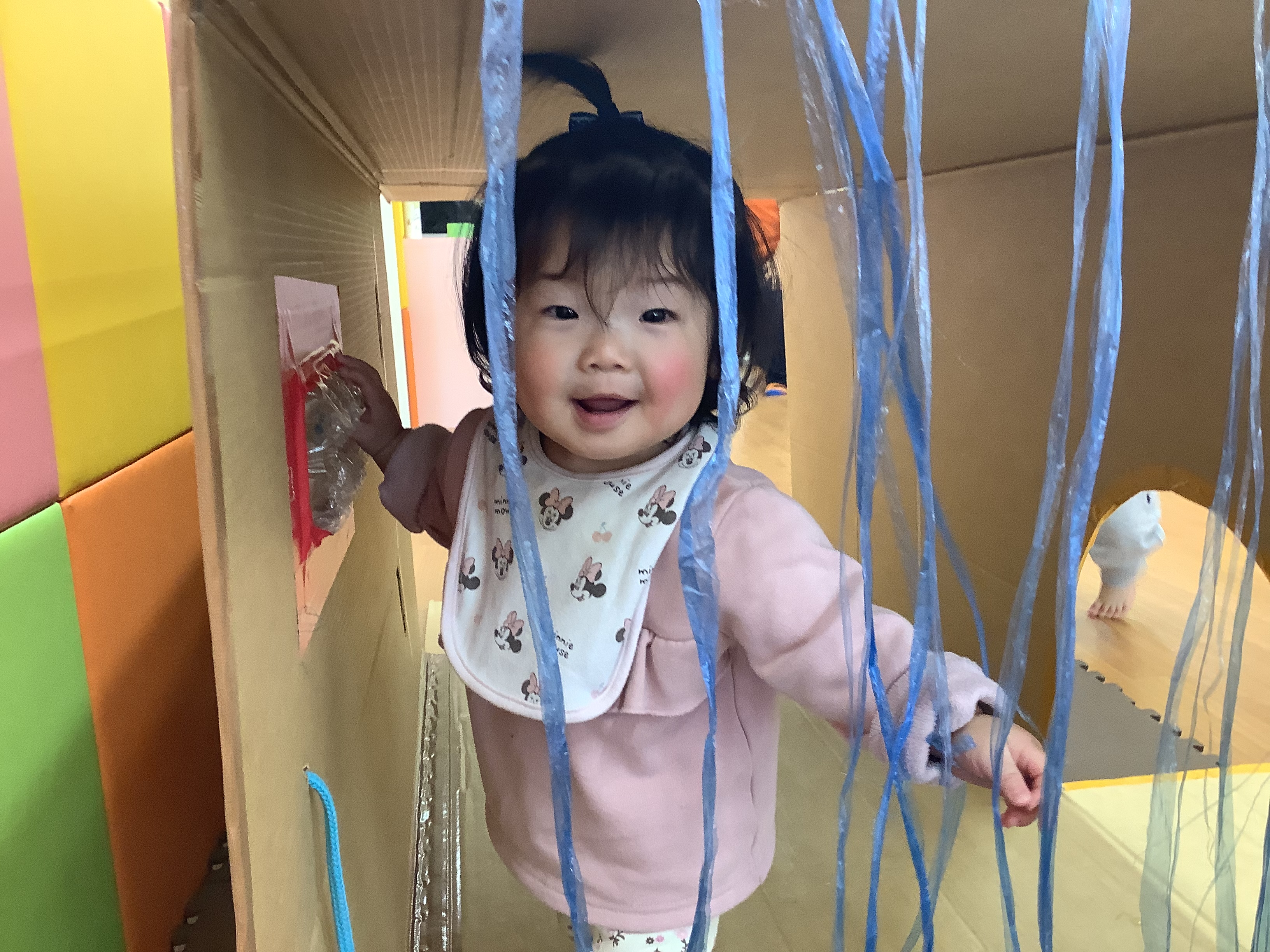 お部屋の中の段ボールトンネル。つかまり立ちで遊ぶのに最高です!