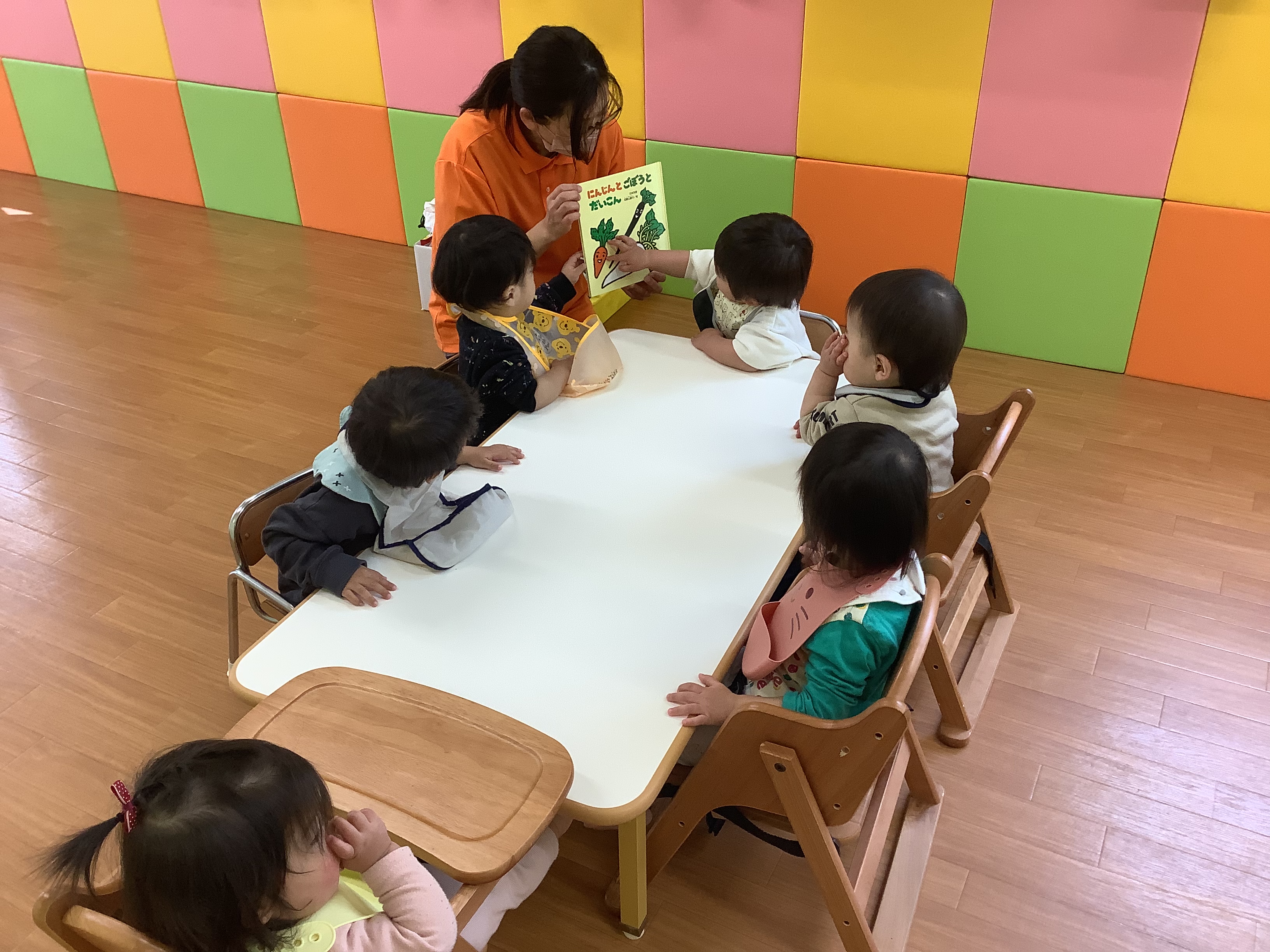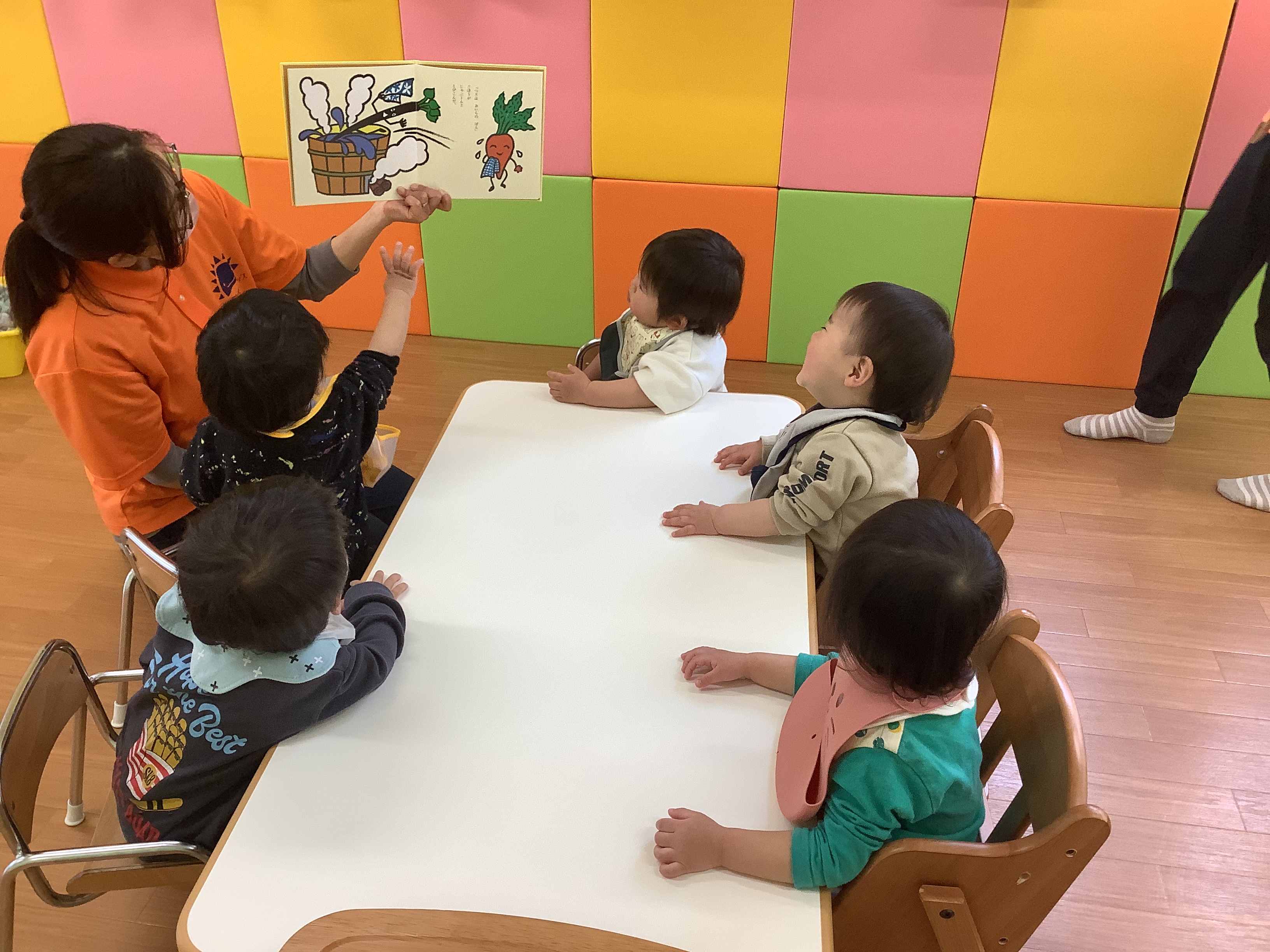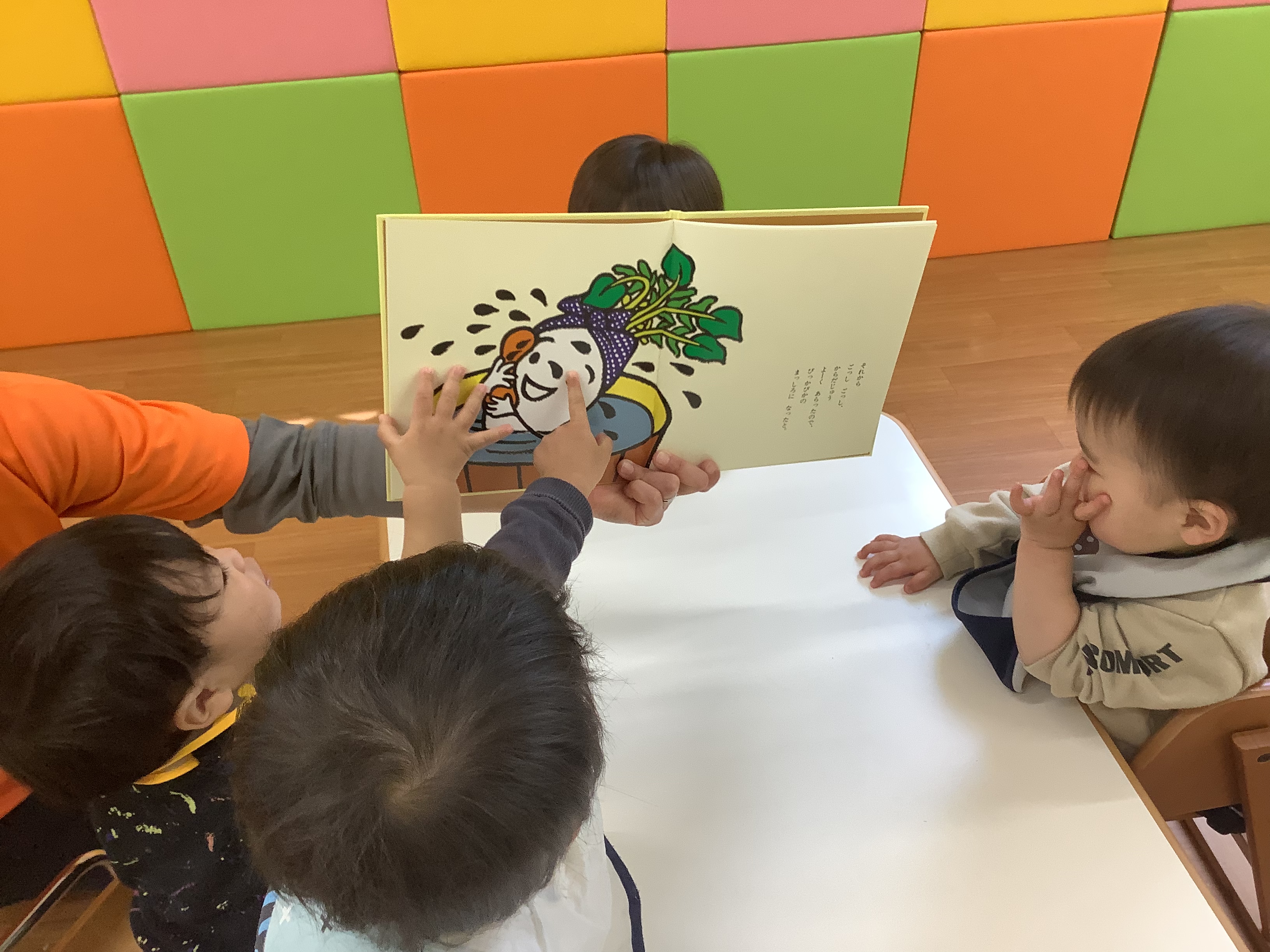 どろんこのお野菜を見たばかりなので、土のついた野菜たちがお風呂に入ってキレイになる絵本を見て「キレイキレイ?(洗ってるの?)」と言っている子もいました。