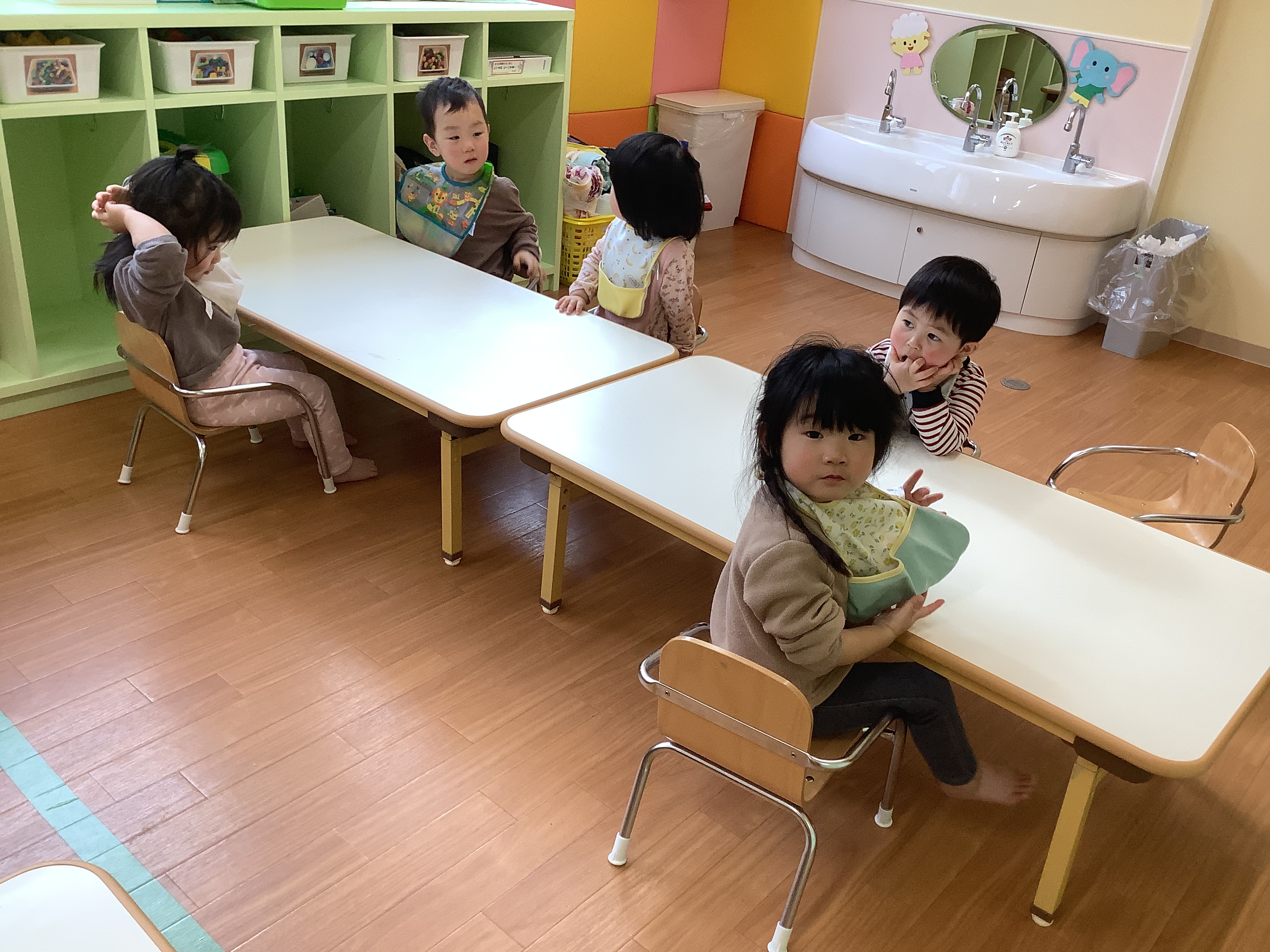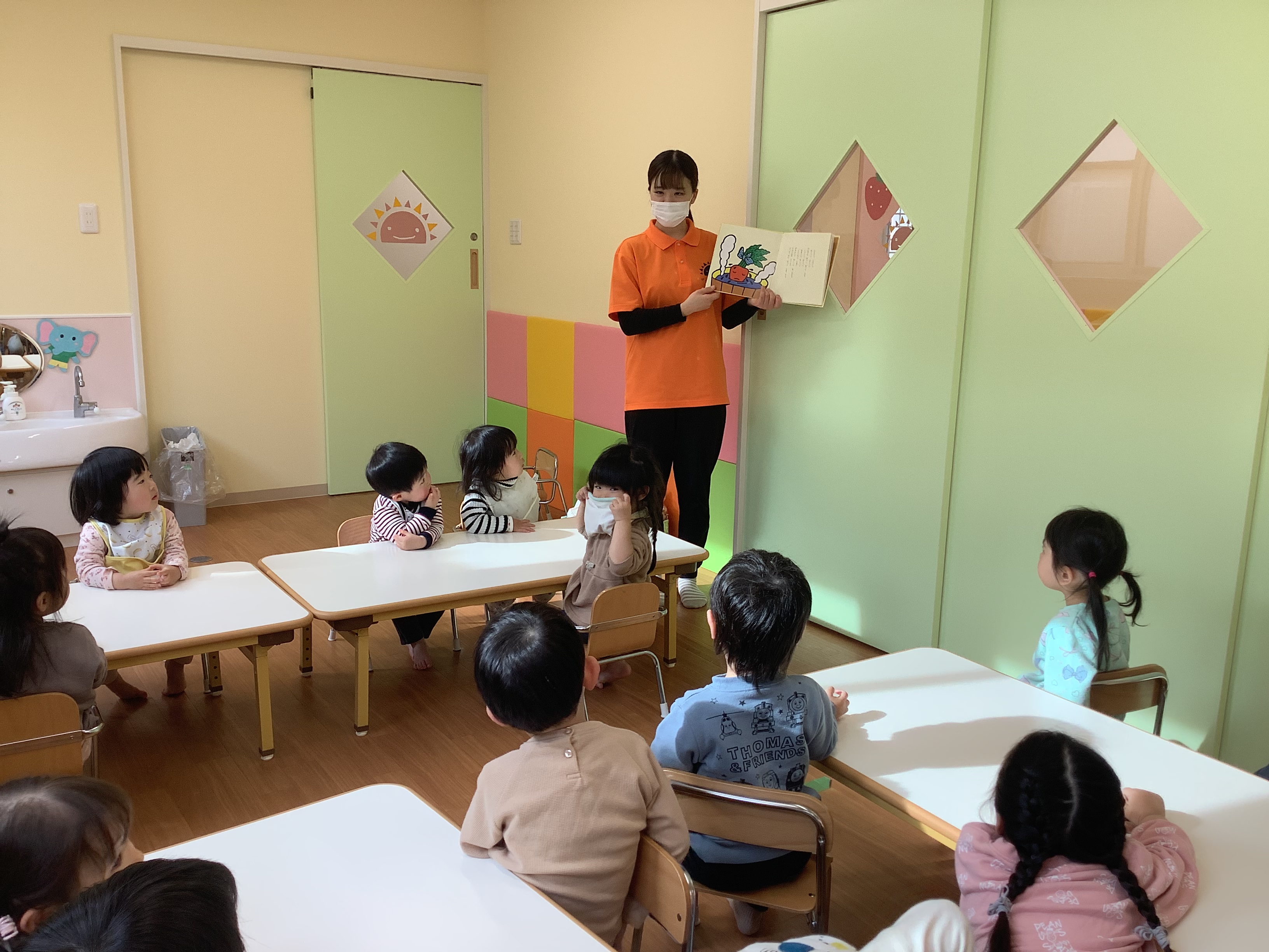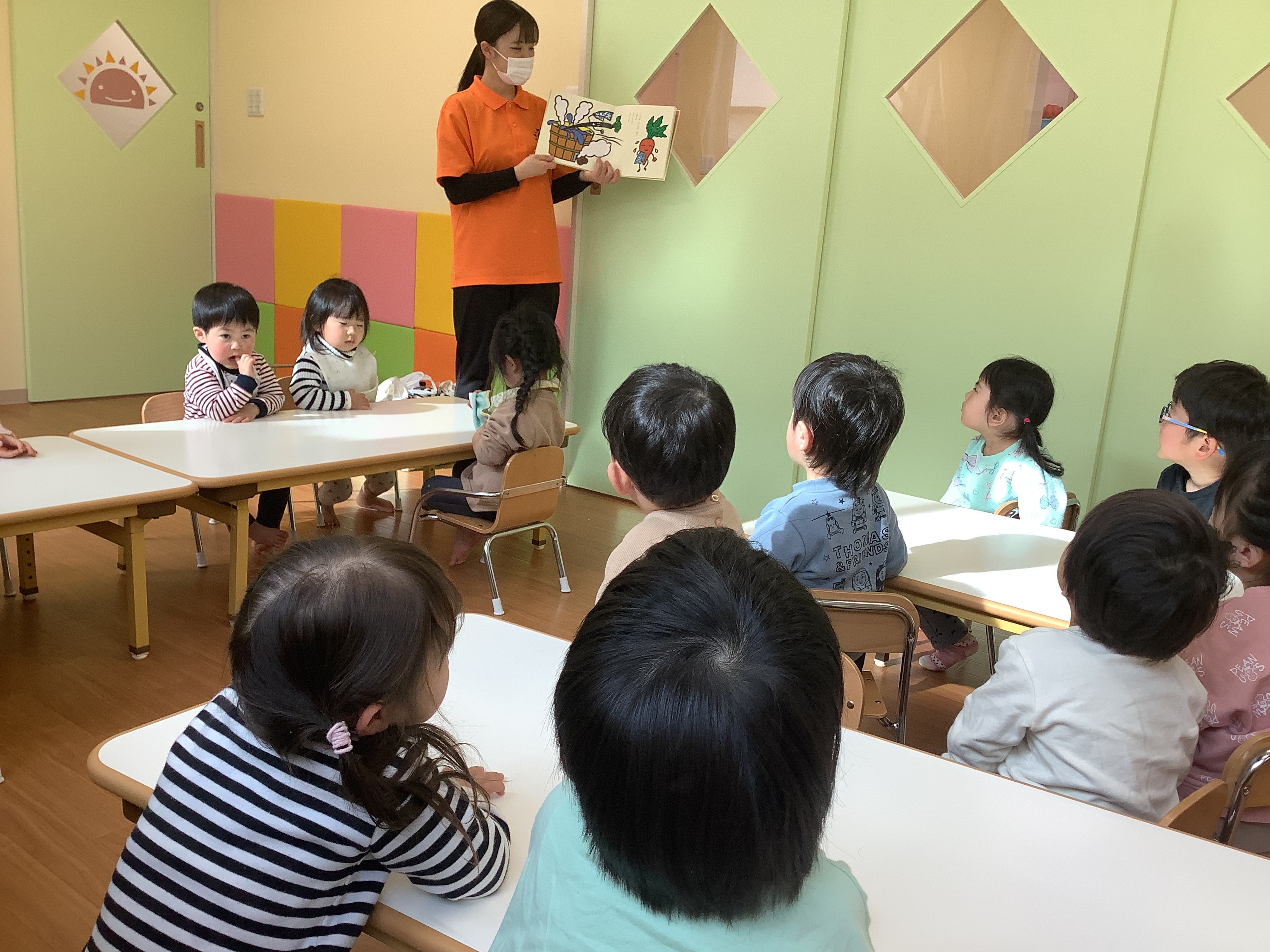 どろんこのお野菜を見たばかりなので、土のついた野菜たちがお風呂に入ってキレイになる絵本を見て「キレイキレイ?(洗ってるの?)」と言っている子もいました。