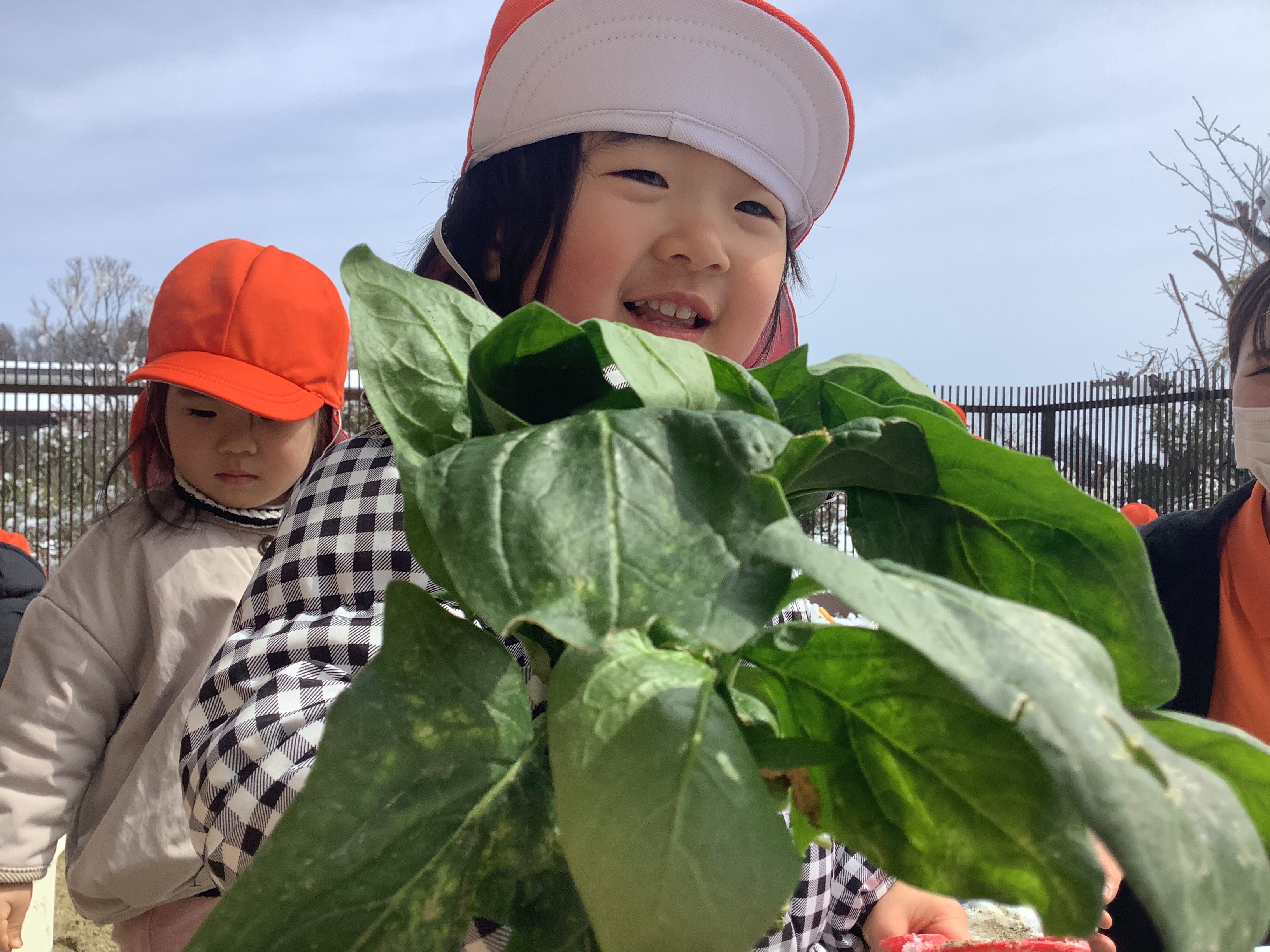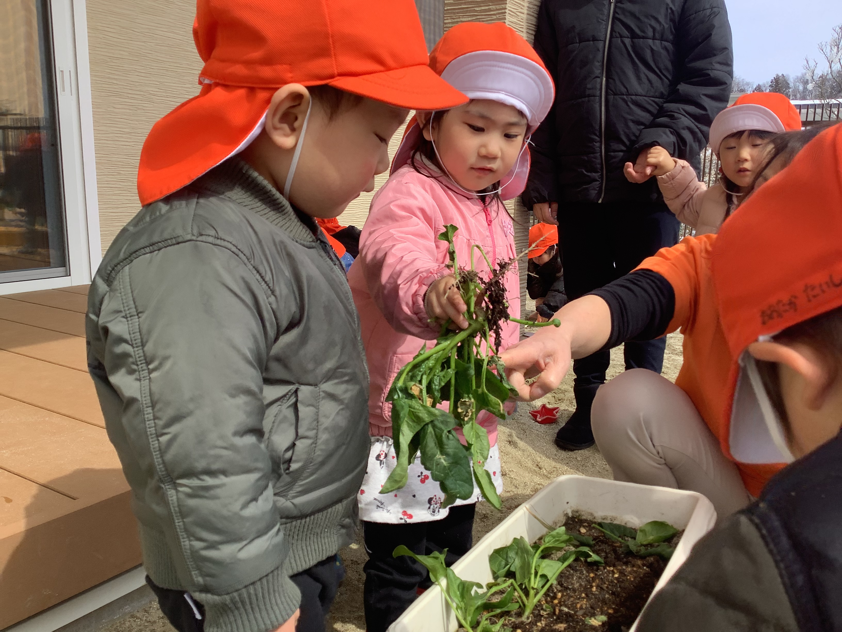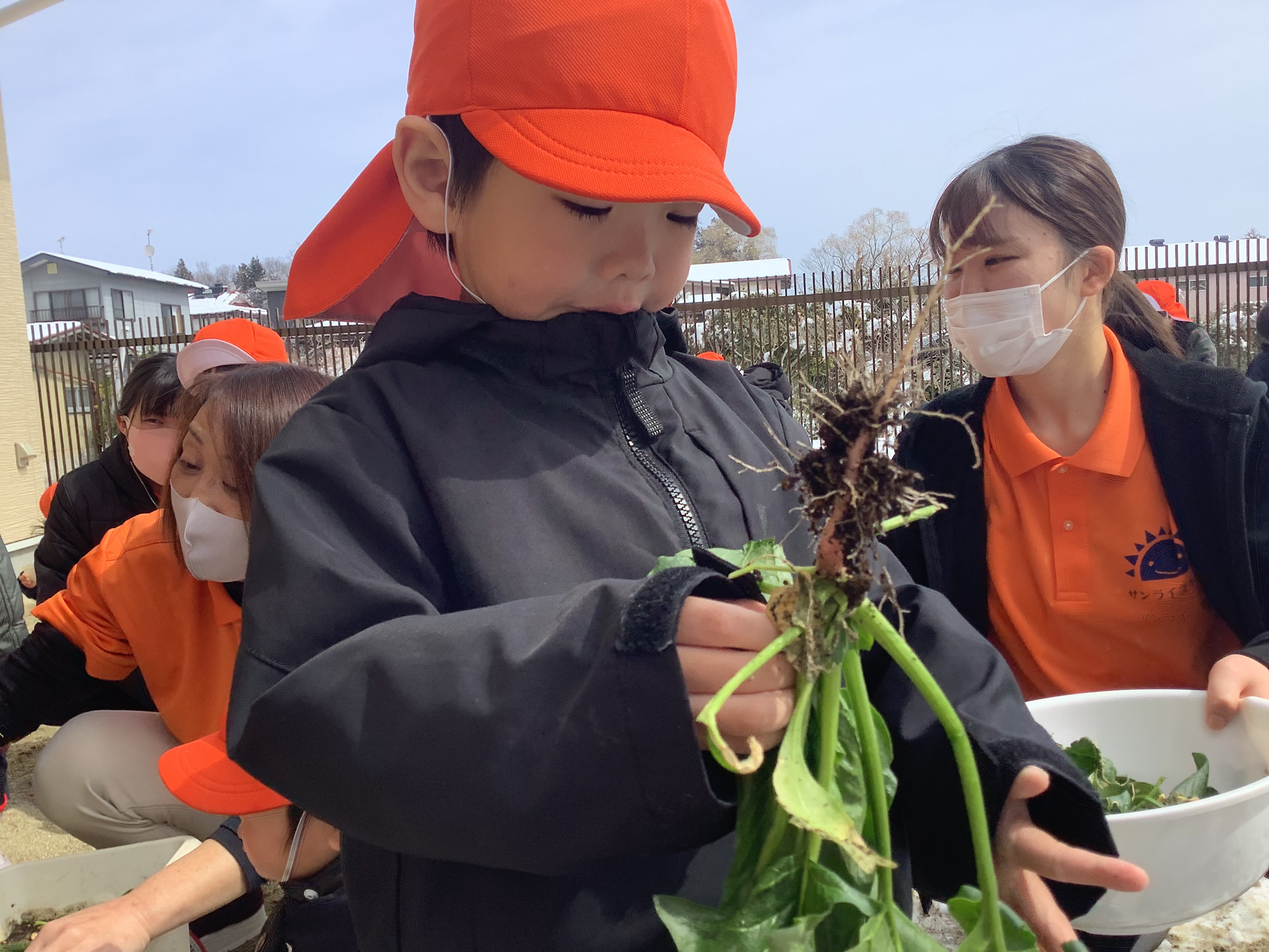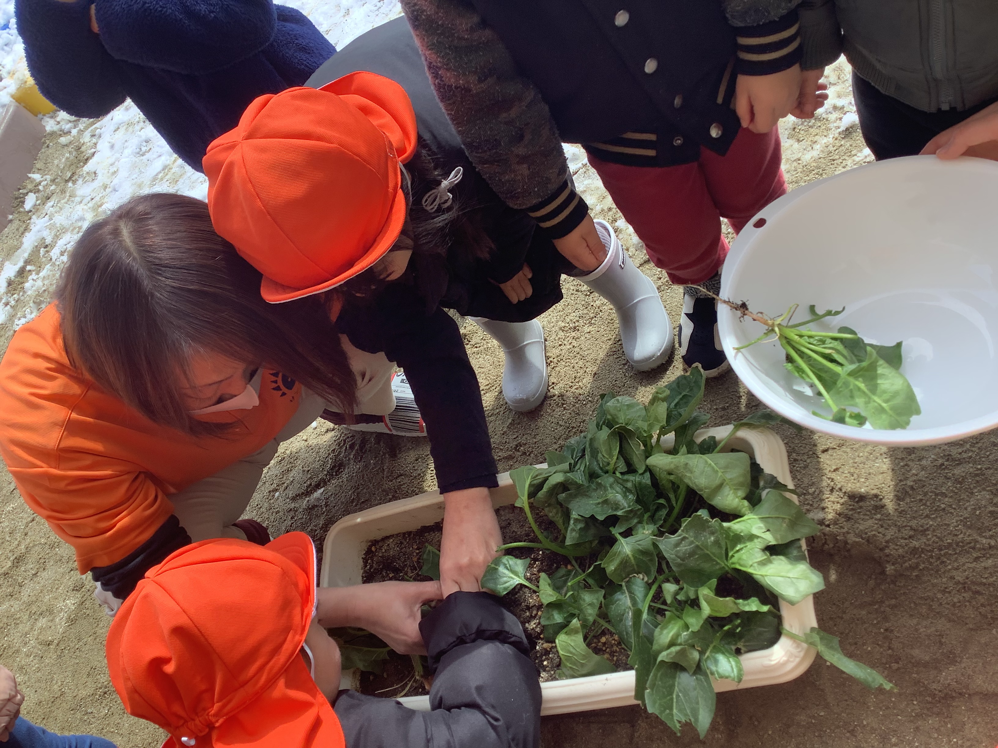今日は、ちょうど・・・ほうれん草の収穫をした子どもたち。