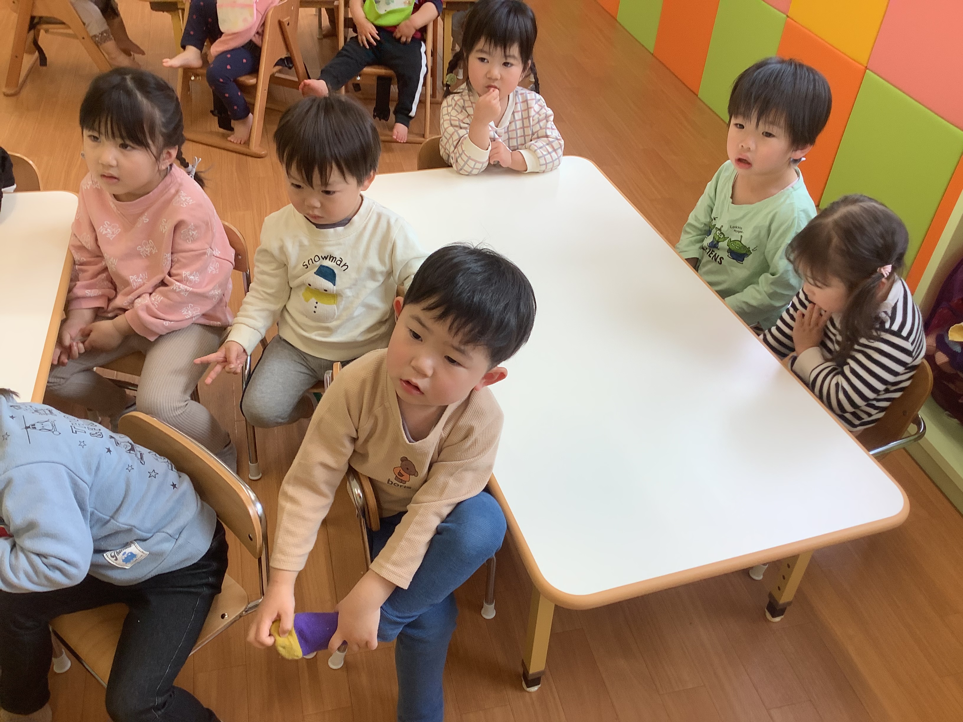 いちごぐみさんは、絵本の内容とまわりの声、両方とも興味があって、キョロキョロしながら聞き耳?を立てていました。たくさんのことに興味を持って吸収しているんですね(*^▽^*)