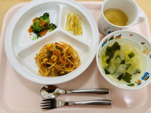 今日はお誕生日会のメニューでした。みんなでお歌を歌って楽しそうに食べている姿が見れて嬉しいです。