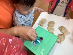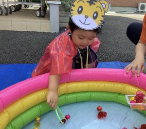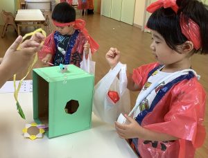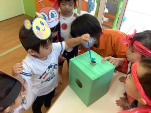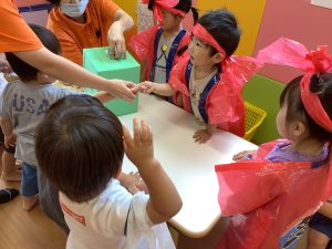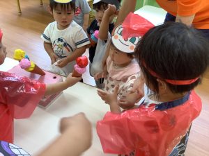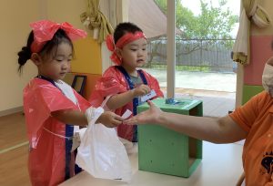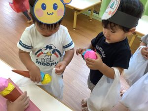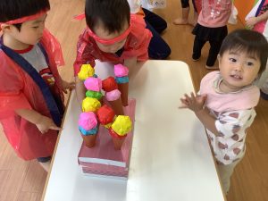 まずは保育者がお店屋さんになり、りんごぐみさんがお買い物に!