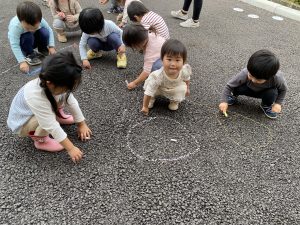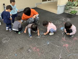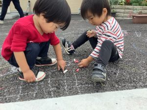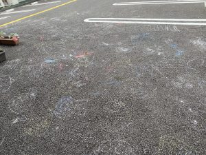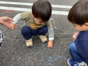 園の駐車場にチョークを使ってお絵描きをしました!