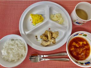 お誕生日会でいつもとは違ったミネストローネが出ましたが、子ども達はトマトで口周りを真っ赤にしていっぱい食べてくれました♪