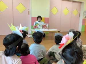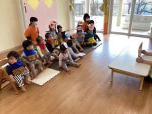 まず紙芝居や節分クイズ!紙芝居は様々な動物たちが豆まきをお手伝い♪