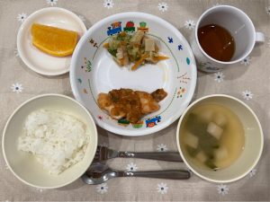 ごはん 味噌汁 魚のナポリタン風 凍り豆腐とキャベツの味噌炒め オレンジ