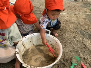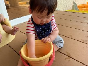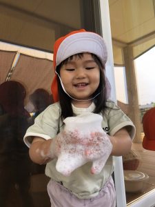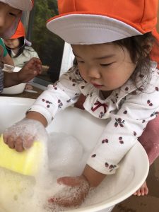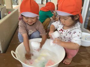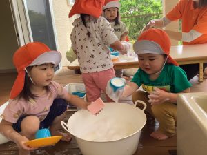 カップに泡を入れておままごとをしているりんごぐみさん🥣