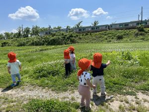田んぼ道で草花を摘んだり、貨物列車を見たり…