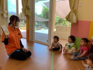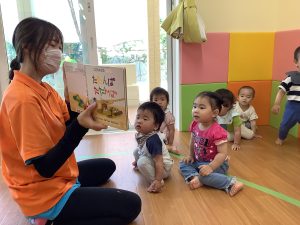 簡単な音の絵本なので1歳児いちごぐみのお友達も