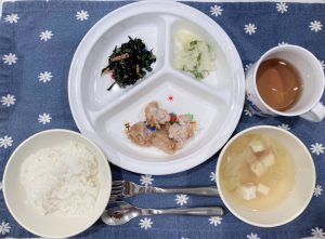 お誕生日メニューで、給食の鶏の唐揚げはみんなあっという間に食べ終わり、「唐揚げ!!」とおかわりしてくれました。おやつのココアパンケーキは、口いっぱいにホイップを付け、一生懸命食べている様子を見る事が出来ました♪