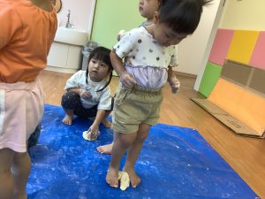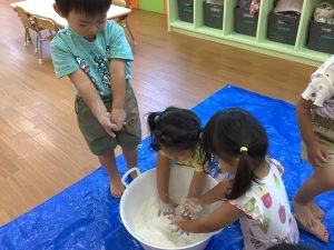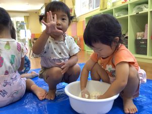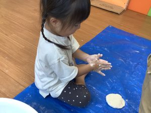 まずは小麦粉の状態に触れて「サラサラ〜!」「手白くなった〜」と発見を楽しむりんごぐみさん。