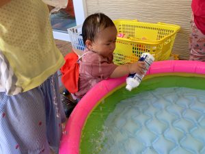 水遊び始めの頃は涙も見られていたももぐみさん。