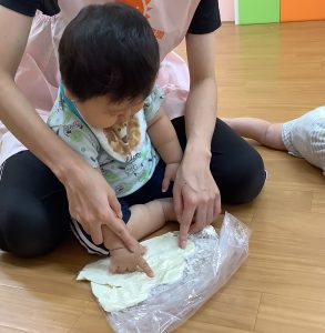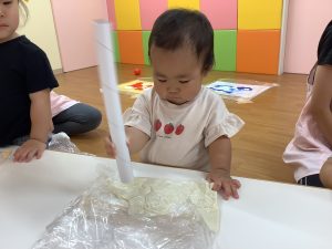 絵の具や小麦粉粘土の感触遊びをしました。