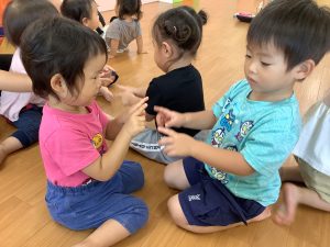 お友達と手や指で触れ合ってご挨拶をします。