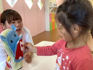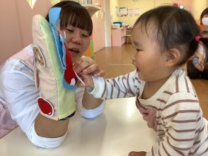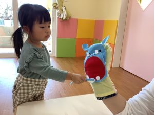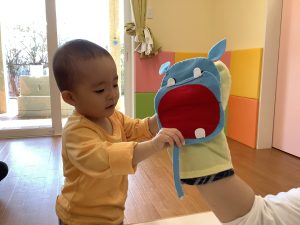 その後は、保育者からの出し物で、食いしん坊のカバくんのお話を見ました✨食べ物を食べさせたり、歯磨きしてあげたり、子どもたちも参加しながら楽しめていました♪
