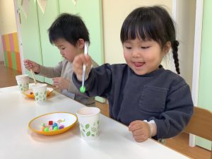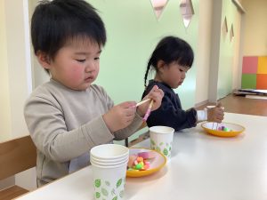 バキューン🔫の持ち方で持つことを知らせると、意識しながら集中してつまんでいました😆集中力もついてきて、さすがりんご組のお兄さんお姉さんですね🤩