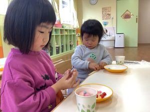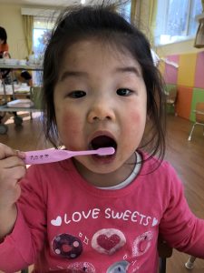りんご組のお友達は、歯磨きやお箸の練習を始めました。