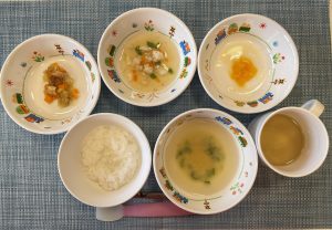 (写真は普通食です。年齢によって盛り付け量を変えて、提供しています。)