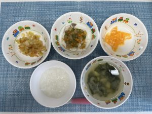 (写真は離乳食後期です。年齢によって形、固さ、盛り付け量を変えて提供しています。)