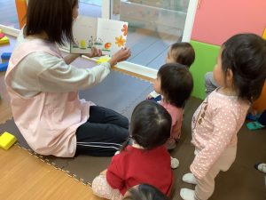 かくれんぼのお話で、「もういいかい。」「まーだだよ。」の言葉を子どもたちは好んで真似する姿が可愛らしい絵本の時間でした!