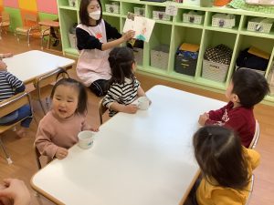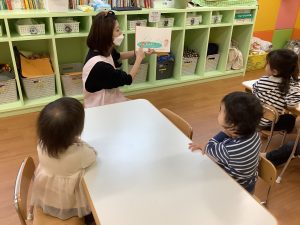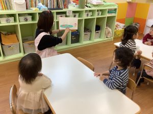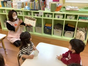気持ちが通じたり、お話したりすることは楽しいね♪が知れる絵本で、子どもたちも言いやすい言葉を真似して言ってみながら楽しんでいましたよ☺️