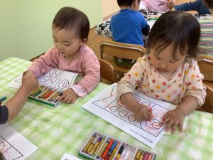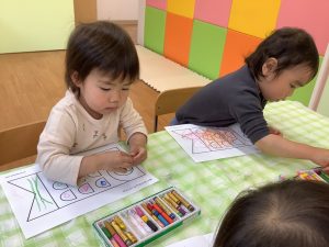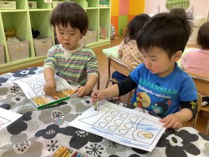 りんご組さんは鯉のぼりの塗り絵をしています✨目は〇〇色!と好きな色を選んで、