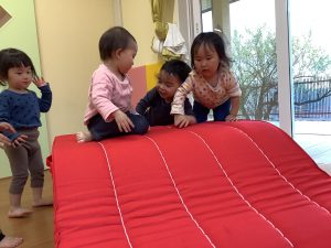 また、室内で体を使って遊ぶ姿もありました。マットの滑り台は大人気!