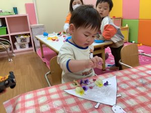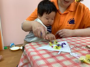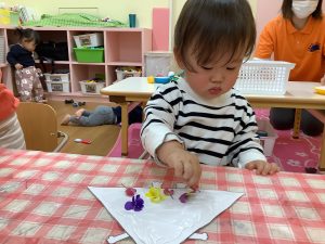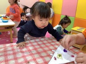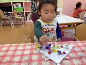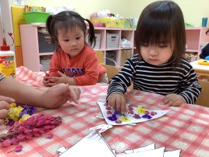 そんなきれいに咲くお花を少し摘んできて、いちご組さんは製作にも使って見ました☘️