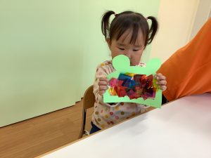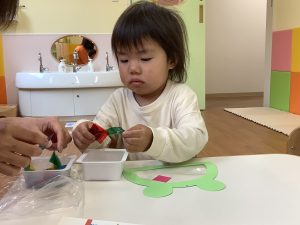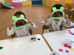 製作活動で、カエルさんの傘を作っていますよ🐸