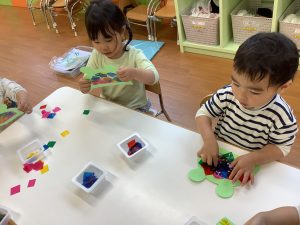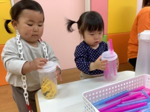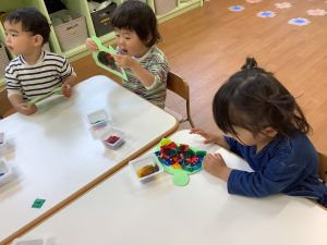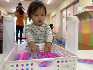 チェーン通しやストロー通しで指先を使って遊んでいます✏️