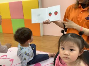 1歳児さんがいちごの絵本を見ていました。みんなの大好きないちご🍓