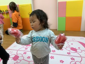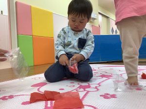 みんなで赤い花紙を袋に詰めて、いちごを作りました♪