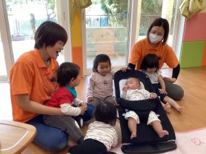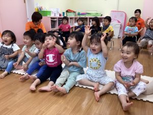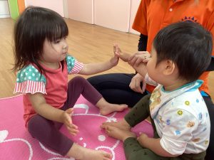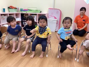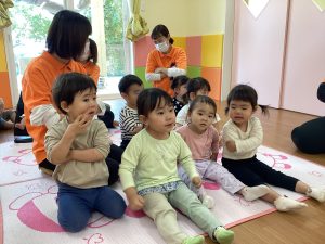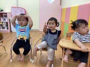 音楽に合わせて体を動かしたり、挨拶の歌でお友達と関わりを楽しんだりして過ごしています!