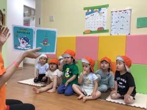 りんご組さんが、園庭で水や泥で遊び前に、絵本をみんなで見ていました!