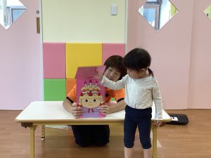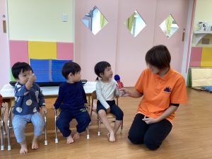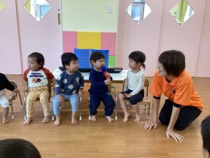 2歳児さんの自己紹介を見て、小さい子たちも自分の名前を言って見ようとする姿が