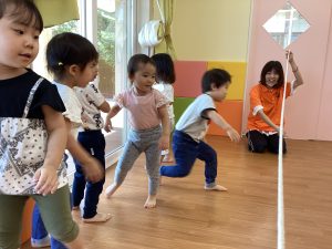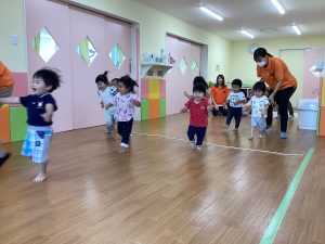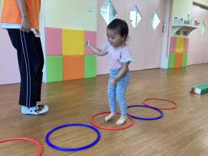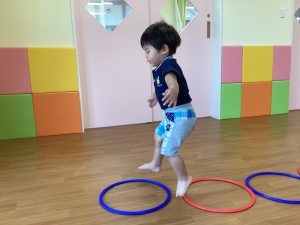もも組さんといちご組さんはフラフープの中をジャンプジャンプ!