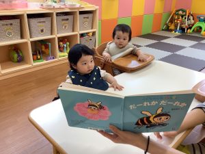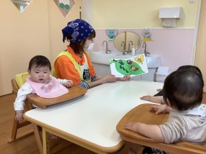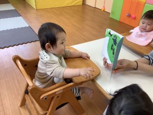 保育者と一緒に月刊絵本を見たり、絵本に出てくる生き物たちを触ったりして