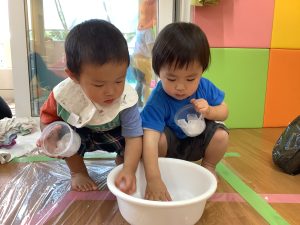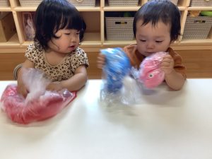 いちご組さんともも組さんも、氷を触ったり、小麦粉粘土を袋に入れて触ったりして感触遊びを