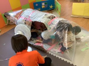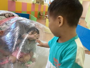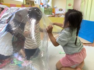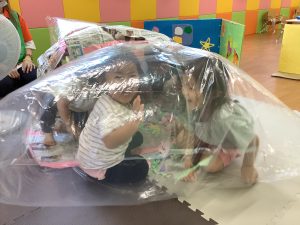 りんご組のお友だちとビニールハウスごっこをしました😆扇風機の風でお家が膨らみ、