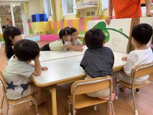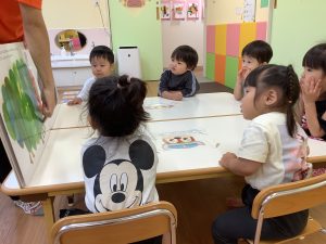 2歳児のお友だちは、話の内容を覚え、保育者のセリフに合わせて、一緒に言ってみながら、楽しむ様子が見られました♪