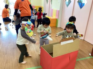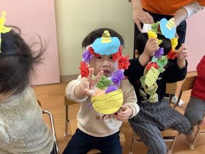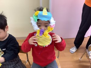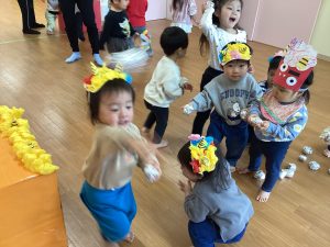 各クラスとても可愛らしい鬼のお面で、子どもたちは鬼になりきって楽しんでいました🎵
