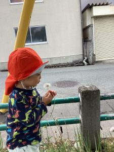 たんぽぽの綿毛を見つけて、早速フーッと吹いてみました!