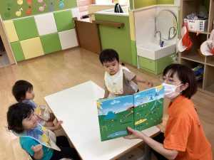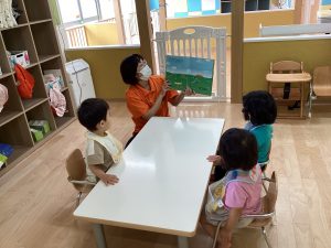 どんなお話なのか、先生のお話に耳を傾けて聞いている子供たち