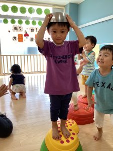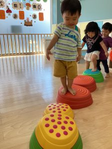 なかなかお散歩に行けない日でも、お部屋でバランスストーンを使って いち に、いち に