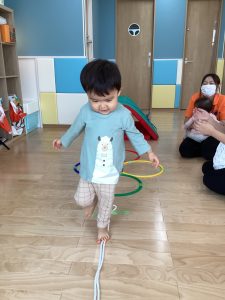 体操のカリキュラムではマットのトンネルやフラフープを使ったサーキット遊びしてみました✨
