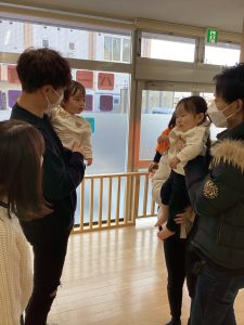 親子レクレーションで行ったのは「あくしゅでこんにちは」の曲に合わせて、保育室内を歩きながら保護者の方同士で会話をしていただくという自己紹介ゲーム!