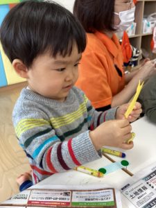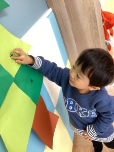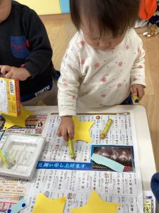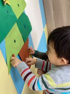 サンタさんが来てくれますように!という願いを込めて、クレヨンやシールを使ってオーナメントの製作を行いクリスマスツリーに飾ってみました🎄