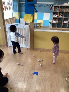 と言って、豆まきの豆を作ったり、投げたりする子どもたち