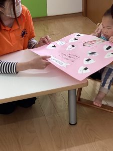 おにぎりの絵本が大好きでいつもおにぎりの絵本を一生懸命見ていたお友達に、みんなで作ったおにぎりを貼ったメッセージカードをプレゼント🎁
